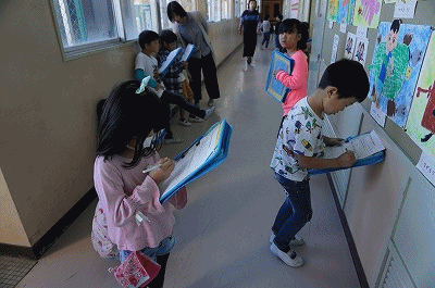 友達の作品の上手なところや工夫してあるところを見つけて、メモしています。たくさん見つけられたかな・・・?
