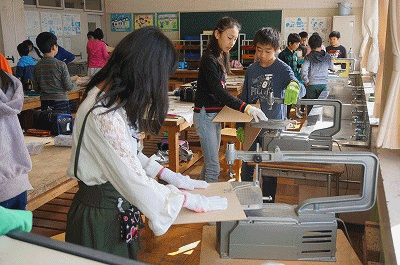 電動糸のこぎりを使って、板を切っています。電動のこぎりを使うのは、初めてのようです。緊張しながらも楽しそうに作業を進めていました。思っていたよりも上手に切れて、子どもたちは満足げでした。