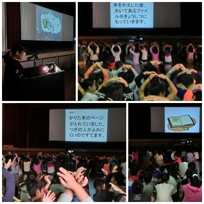 11月5日(月)の集会は、図書委員による絵本の読み聞かせが行われました。絵本の題名は「おこだでませんように」です。図書委員がページを分担して、順番に読んでいきました。緊張したと思いますが、それぞれの責任をきちんと果たしました。最後には、図書室の使い方に関する○×クイズをして楽しみました。図書委員の皆さん、お疲れさまでした。