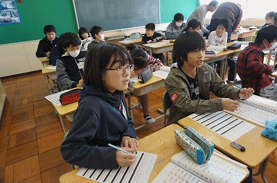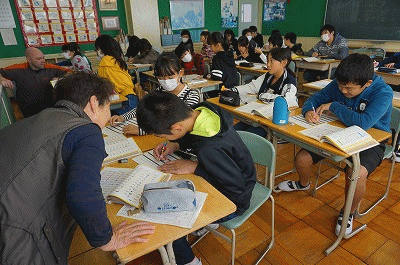 子どもたちは、修学旅行や夏休みに出かけた旅行などについて、英語で話す活動をしています。かなりレベルが高い内容なので、先生や支援員さんの助けを借りて取り組んでいました。