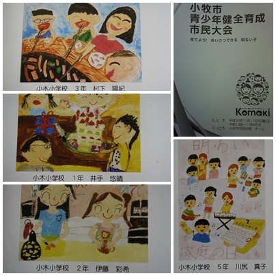 11月11日(日)に小牧市民会館で「小牧市青少年健全育成会議」が開催されました。会の中で、「家庭の日」並びに「非行防止」に関する絵画・ポスターで、優秀な作品を描いた小中学生の表彰が行われました。小木小学校からは、何と最優秀作品に3年生の村下君と1年生の井手君の2人が選ばれました。とても素晴らしい結果です。優秀作品にも5年生の川尻さんと2年生の伊藤さんが選ばれました。4人ともステージに上がり表彰を受けました。おめでとう!よくがんばったね!