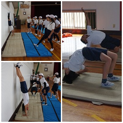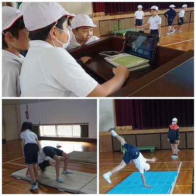 マット運動をしています。壁倒立を練習するグループ、側転を練習するグループ、倒立からブリッジを練習するグループがありました。ここでも、今年の夏に導入されたダブレットパソコンが活躍をしていました。「追っかけ再生」という機能を使って録画し、子どもたちは自分の演技を確認していました。