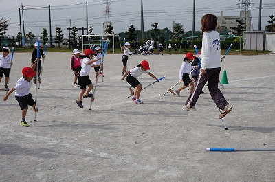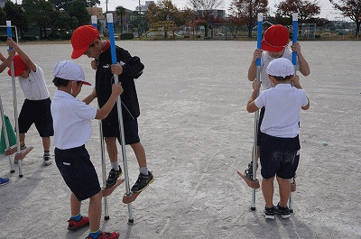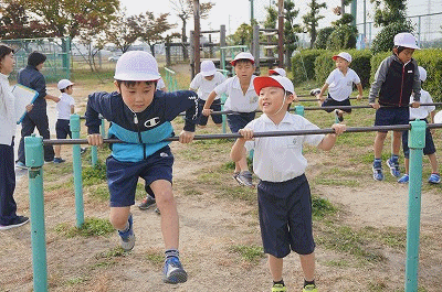 1年1組は竹馬の練習をしています。(写真上・中) 1年2組は鉄棒の進級テストに挑戦しています。(写真下)
