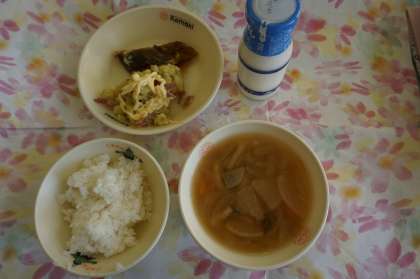 こんだて ごはん、吉野汁、白身魚のみぞれ煮、ほっくりさつまいも(マヨネーズ)、牛乳