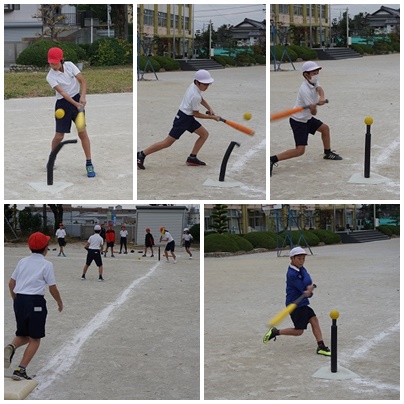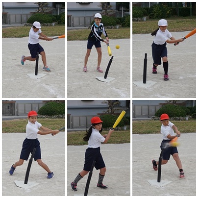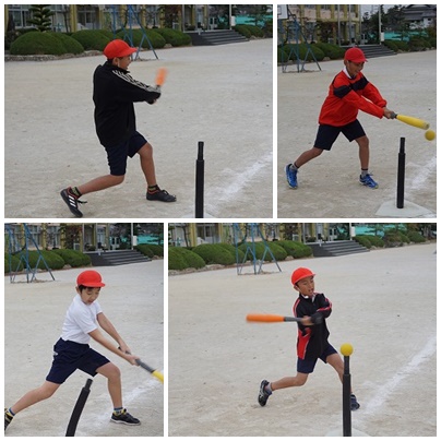 ティボールをしていました。5年生ぐらいになると野球のルールをだいぶ理解しているようで、ゲームらしくなっています。ホームランをかっ飛ばそうと、豪快なスィングをする子もいれば、ちょこんと当ててヒットを狙う子など様々です。