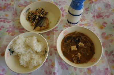 ごはん、きのこのみそ汁、さばの照り焼き、ほうれん草の彩り卵炒め、牛乳