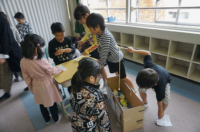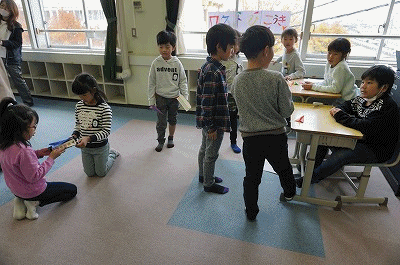 2年生の子どもたちが、1年生を招待しておもちゃ屋さんを開いています。どの子もとっても楽しそう。担任の先生も一緒に遊んでいました。