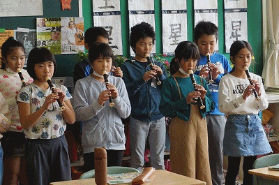 写真下:4年2組。リコーダーによる合奏をしています。きれいな音色が響いてきました。