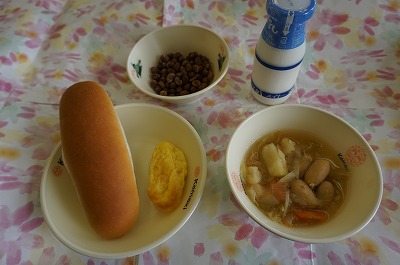 ミルクロールパン、ポトフ、オムレツ、チョコタフィー(大豆のココアがらめ)、牛乳