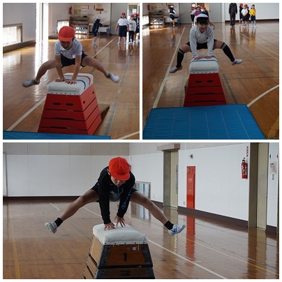 跳び箱をしています。上手な子が跳ぶ様子を見て、こつをつかんだ子が多くいたようです。
