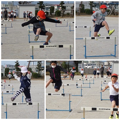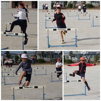 ハードル走の練習をしていました。ハードルの高さを少し上げただけで、跳ぶのがずいぶん難しくなります。ハードルに引っかかってハードルを倒してしまったり、自分が転んでしまったりする子もいましたが、かっこよく跳べた子もいました。写真を見て下さい。