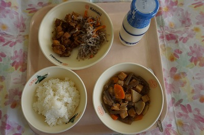 ごはん、厚揚げ丼、鶏肉とさつまいもの甘辛、もやしの赤しそあえ、牛乳