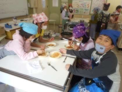 まもなく2学期が終了しようとしています。運動会・遠足・書写や図工の競技会など、たくさんの行事の中で子どもたちは大きく成長し、学級としての『団結』も高まりました。今日は、今学期を振り返り、お楽しみ会「ホットケーキ作り」を行いました。家庭科の学習は、始まっていませんが、上手にフライパンを使いながら、おいしそうに調理をする姿が見られました。楽しい思い出となりました!