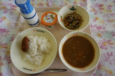 カレーライス(麦ごはん)、カリカリチキンカツ、ごぼうサラダ(ごまドレッシング)、クリスマスデザート、牛乳