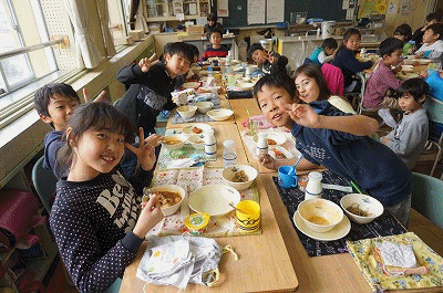 今年最後の給食は、子どもたちが大好きなカレーライスでした。クリスマスデザートもついて、みんな大喜びしていました。写真は3年1組の様子です。