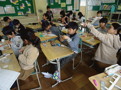 図工の授業のように見えるかもしれませんが、算数の授業の様子です。方眼紙にそって正方形や長方形を切り取り、切り取った面をつないで立方体や直方体を作ります。上手にできたかな・・・?