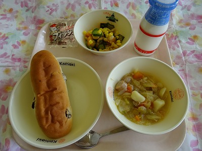 レーズンロールパン、ポトフ、かぼちゃと豆のサラダ(ごまドレッシング)アーモンド小魚、牛乳