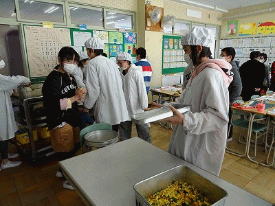 下の写真は6年1組配膳の様子です。このクラスの配膳はいつも迅速です。