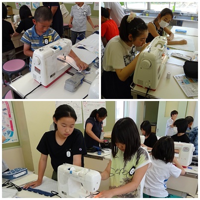 ミシンを使って袋づくりをしています。できあがった袋は、いろいろな場面で活用できそうです。