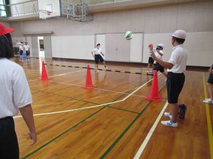 最初の1時間目よりもボールの扱いがうまくなってきました。また、各チームで声をかけ合うこともできるようになってきました。