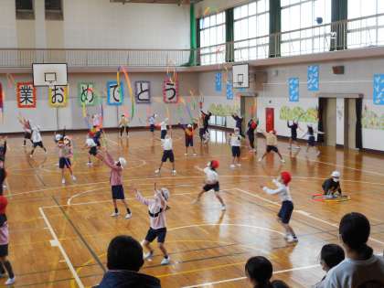2年生は、「紅蓮華」の曲に合わせてフラフープの演技です。