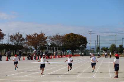 1、短距離走(60m) 2、全校競遊玉入れ 3、みんなで運ぼう!!大玉転がし
