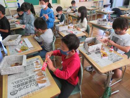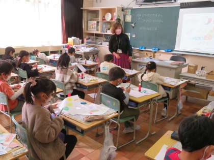 1年生図工「うつした かたち」・生活「たのしい あき いっぱい」の授業です。