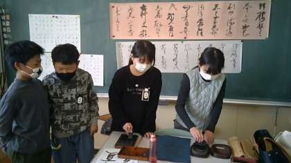 いろいろな種類の硯を見せていただいたり、かなの成り立ちについてのお話を聞いた後、それぞれが書きたい字を選び、行書で書く練習をしました。