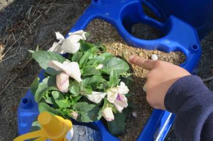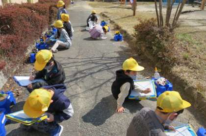 秋に植えたパンジーが大きくなり、スイセンの球根から芽が出てきました。小さなスイセンの芽の発見に大喜びしました。葉の形をよく見たり、手触りを確かめたりして、観察カードに気づいたことをまとめました。