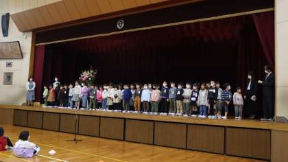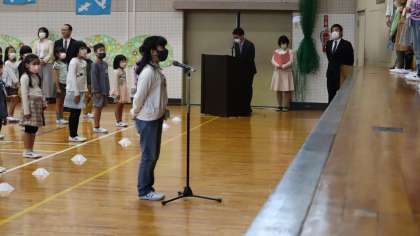 始業式の中で先生や職員の紹介をした後に、1年生との対面式が行われました。新一年生は全員ステージの上に立ち、代表の6年生から「歓迎のことば」を聞きました。一年生のみなさん、早く小木小学校に慣れてくださいね。
