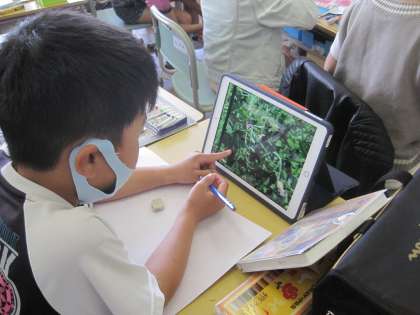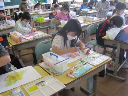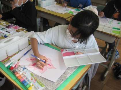 図工で春の草花を描きました。みんな自分で撮った写真を見ながら、真剣に描きました。