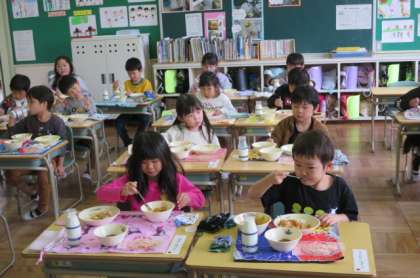 「先生!今日から給食だね!」「今日はカレーライスだよ!」と朝から子ども達は今日から始まる給食を楽しみにしている様子でした。