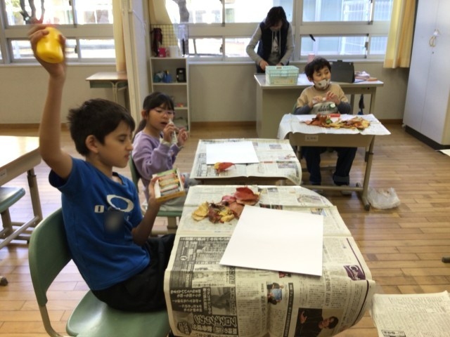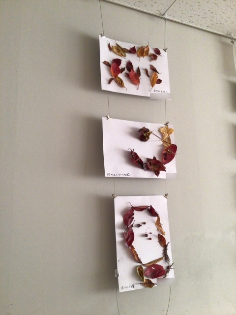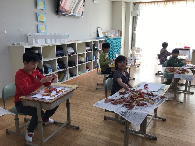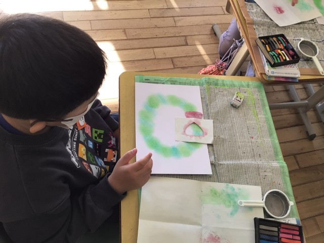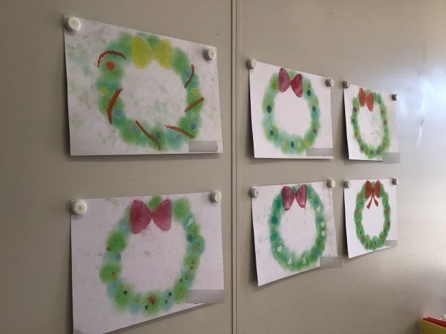 図工でクリスマスリースのパステルアートや落ち葉アートを行いました。
