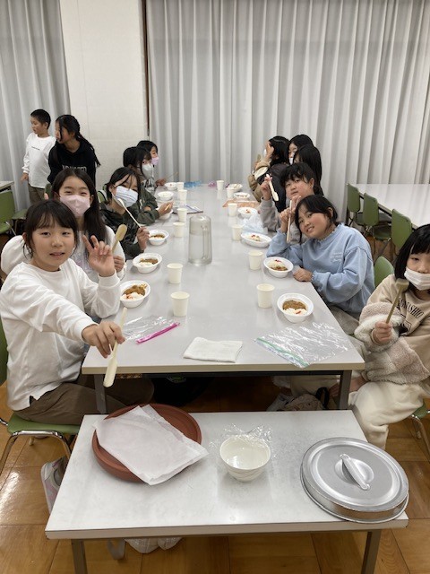 いっぱい体を動かしたのでお腹が空いたことでしょう。ウインナーカレーを手作り竹スプーンでいただきまーす。