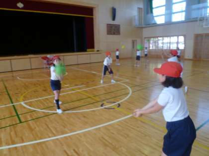 トス(オーバーハンドパス)とレシーブ(アンダーハンドパス)を使い、「つなぐ」を意識して、何とかボールに食らいつきます。まだまだですが、元気いっぱいに声を出し、笑顔満点でした。