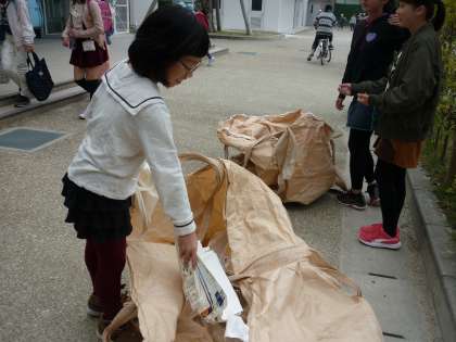 今日はリサイクルデーで、アルミ缶と牛乳パックを集めました。