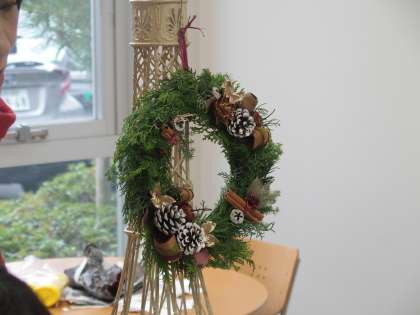 今日はフラワーアレンジメントの活動日でした。今回のテーマは「クリスマスリース」クジャクヒバとヒムロ杉とブルーアイスを土台に、花材を飾り付けました。部屋いっぱいに広がるほのかな甘い香り。伺うと、これらの植物の香りなのだそうです。見る者の五感をくすぐる冬の作品です。