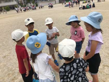 今日は、2年生のお兄さんやお姉さんと一緒に運動場で遊びました。遊びも考えてもらって、たくさん遊んでもらって、気分は最高です!