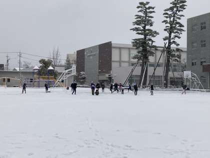 朝から真っ白なグラウンド。今シーズン、初めて雪で遊びました!