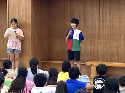 雨が降っていたので、予定を変更して体育館で入村式です。とても広い体育館で、施設の方からもお話を伺いました。2日間よろしくお願いします。