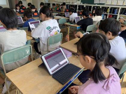 総合的な学習の時間に、情報モラルの勉強をしました。ICT支援員さんに、操作の説明をしていただきました。まずは、ネットモラルの意識を診断する質問に答えました。インターネットやアプリにのせても良い写真はどれですか?など、みんな一生懸命考えていました。これから先も、この授業を思い出して、情報社会の中で必要な考え方を学んでいきましょう。