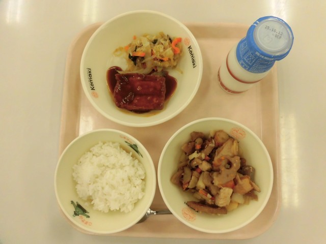 今日は、鶏肉と野菜のうま煮でした。にんじん、ごぼう、れんこん、じゃがいも、などのたくさんの野菜が入っていました。
