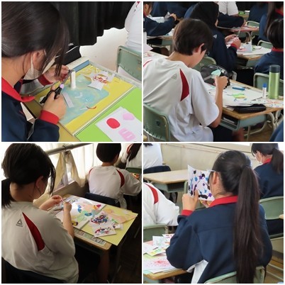 着色した模様を組み合わせて動物にしていました。全員の作品が集まると、素敵な動物園ができそうです