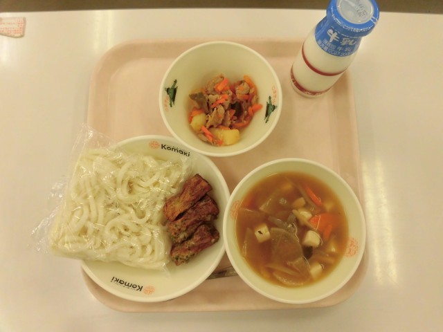 今日は、けんちんうどんでした。だいこんやにんじんなどの根菜類が多く使われていて、そのなかでもごぼうは、食物繊維が豊富で腸内環境の改善に役立ちます。また、ごぼうに含まれるイヌリンには、血糖値の上昇を防ぐ効果もあります。一気に寒くなりましたので、あたたかいごはんを食べて、体調を整えましょう。