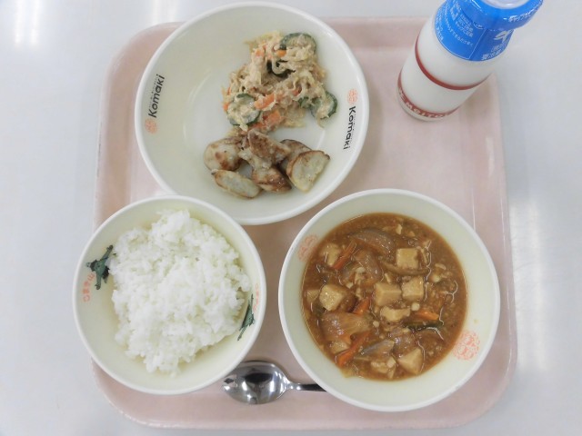 今日は、さといものから揚げでした。令和6年度応募献立で選出されたメニューで、小牧市内の中学生からの応募献立です。一口大に切ったさといもにかたくり粉を薄くつけ、油で揚げて、少量の塩と和えました。