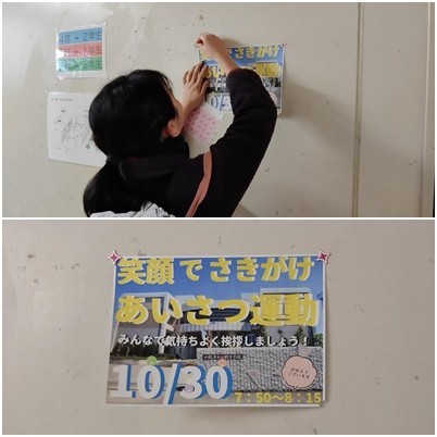 笑顔でさきがけあいさつ運動は、10月30日に行われます。手作りの宣伝チラシを貼っている姿を拝見しました。