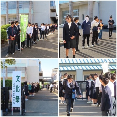 文化祭1日目、10月30日は市内一斉に行われた「笑顔でさきがけあいさつ運動」日です。今回は生徒会も協力しての運動日となりました。地域の方や保護者も参加してくださったのですが、生徒にかくれてしまいました。保護者が帰られるときに「中学生に元気をもらいました」という言葉をいただきました。うれしい一言でした。