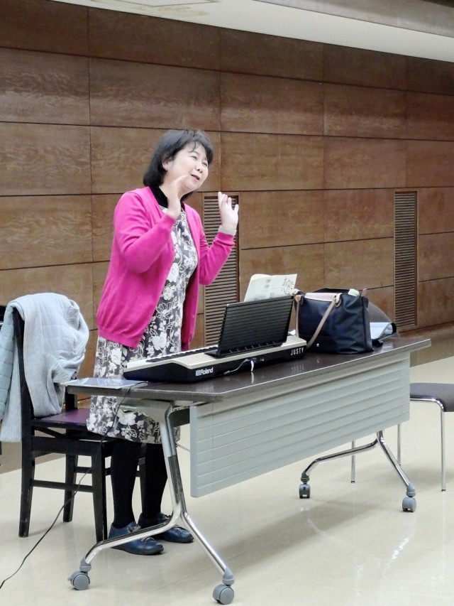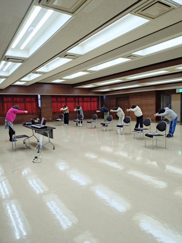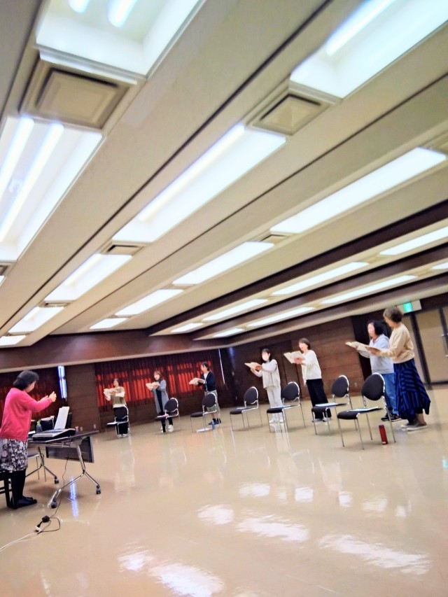 指導者の横井先生は、最初にしっかりストレッチをしてから発声練習に入ります。団員は、全員で8人ですがお仕事や用事と重なり中々全員集まる事が出来ませんが今日は7人参加出来ました。