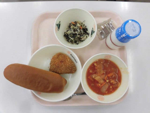今日は、ココア牛乳のもとが出ました。牛乳が苦手でも、ココア牛乳のもとが出る日には飲める!という生徒も多いようです。そんな日の牛乳の残りはなんと、半分に減ります。成長期に大切な栄養素である、カルシウムがたっぷり入っている牛乳です。普段から少しでも飲めると良いですね。