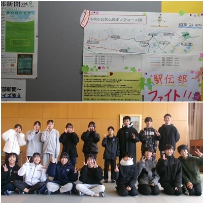14日に行われました。朝の集合時は小雨が降る中でしたが、スタートの9時には雨もほとんどやみ、男女1チームずつ、完走することができました。昇降口、生徒会の掲示板には駅伝を応援する掲示物も貼られていました。
